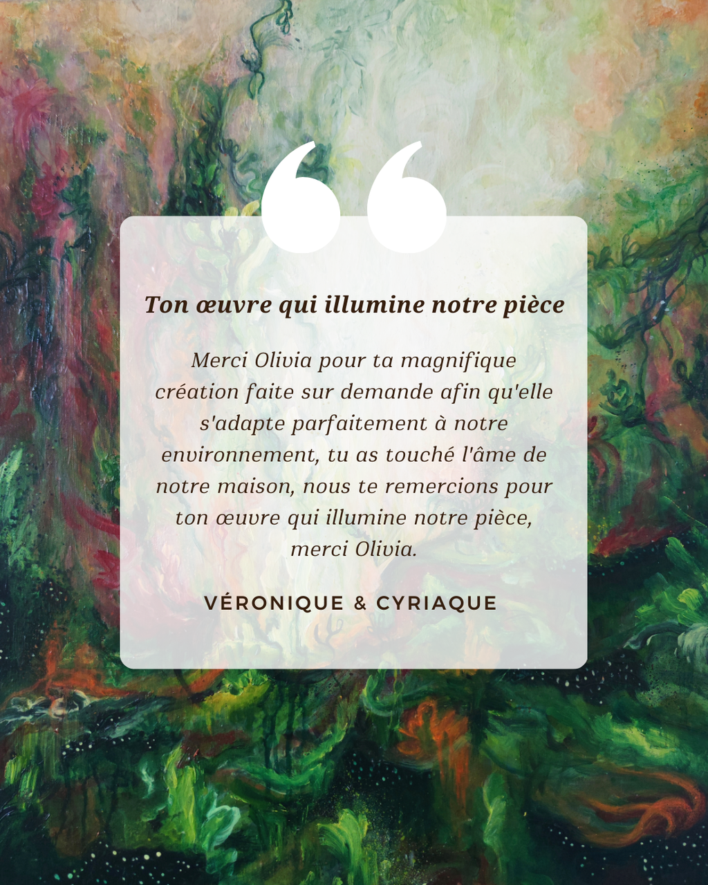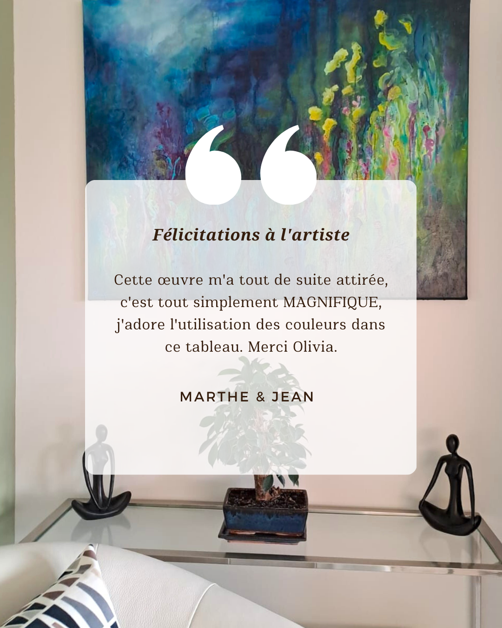 «Ce qui me plaît par dessus tout c'est la vie qui explose dans vos couleurs. Des accords qui expriment la joie et la délicatesse. C'est comme un enchantement.»
